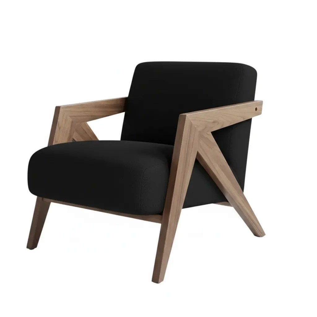 The Lambda Arm Chair features a bold zigzag frame that gives it a sharp and modern look. The wooden arms are built with clean, straight lines that flow directly into the back legs, creating a strong triangular shape on each side. This design mixes sharp angles with soft blocks, making the chair look like a piece of art while maintaining a comfortable, leaned-back position.