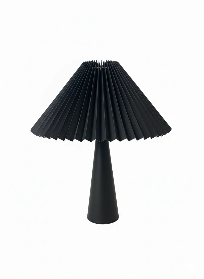 Defined by a dramatic, sharp-pleated shade atop a sleek conical base, this lamp is a study in monochromatic contrast.