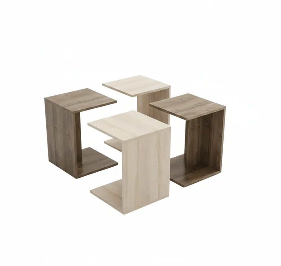 This set is defined by the C-profile silhouette, a minimalist open-box geometry that prioritizes cantilevered surfaces. The form is stripped of all non-essential structure, utilizing a single vertical plane to connect two parallel horizontal surfaces. This creates a visually light, “bracket-like” shape that is as much about the air it encloses as the material itself.