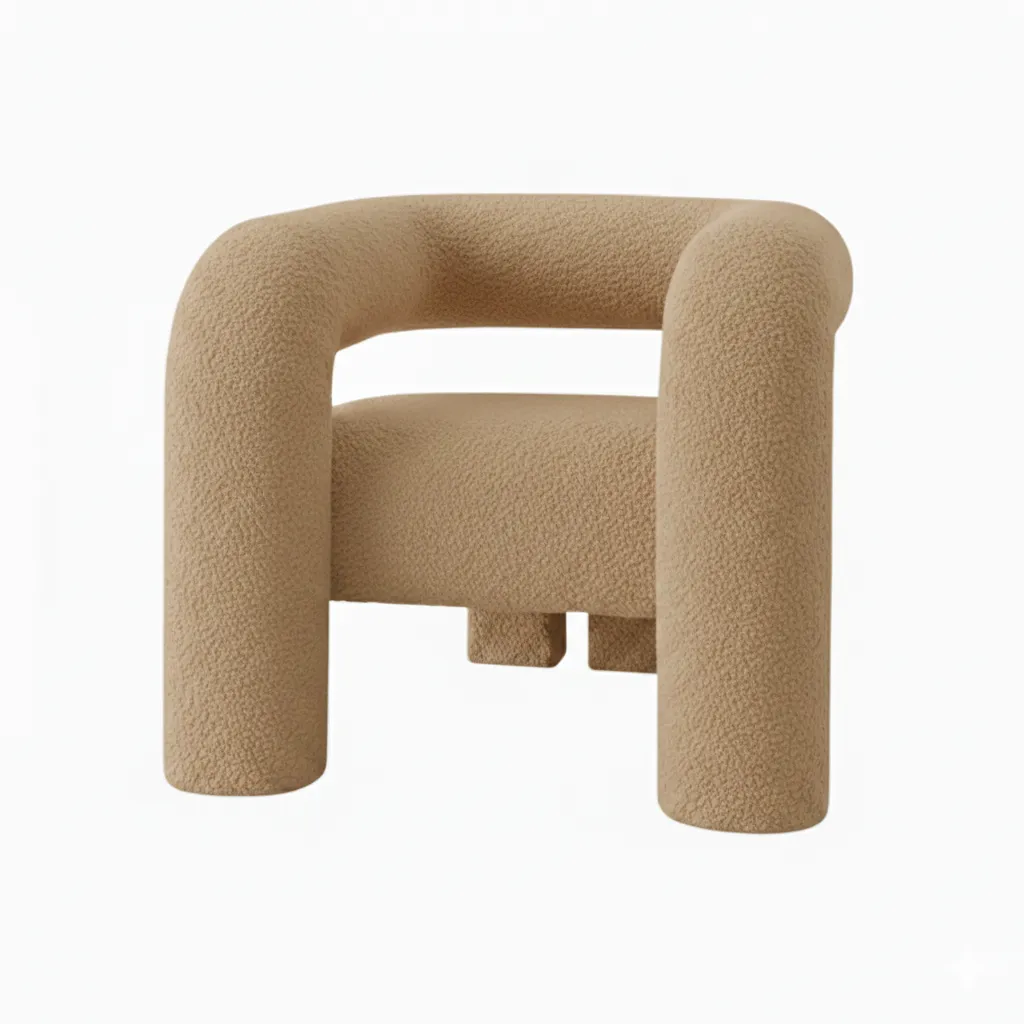 The Double Pillar features thick, rounded tubes that create a soft, chunky look. The armrests and back form one continuous curved piece shaped like a giant horseshoe. Instead of thin legs, the chair rests on heavy, pillar-like columns.
