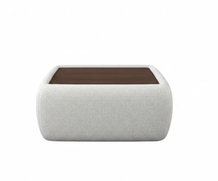 The Nest Tray Table is defined by its encapsulated surface. Its form consists of a large, soft-edged upholstered block that curves upward to create a protective, raised lip around the entire perimeter. This “nesting” silhouette serves as a structural cradle for a recessed wooden top, which sits flush within the center of the frame.