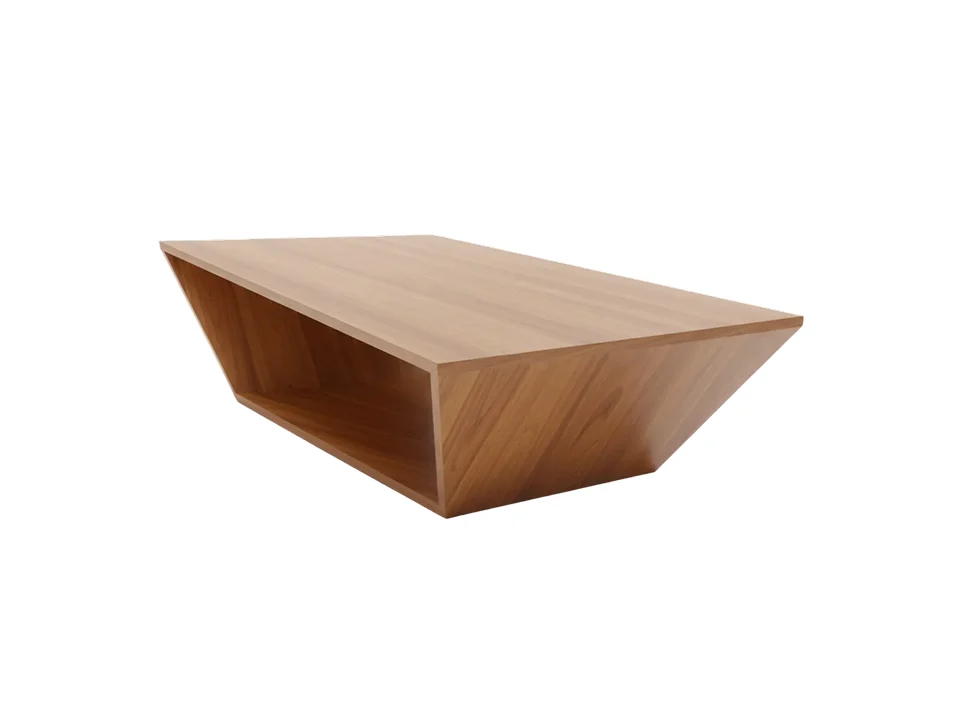 The Otherworld Otterman features a sculptural, angular design with a long rectangular top surface. The body is constructed from flat wooden panels, forming an open, trapezoidal volume with an internal shelf. The sides are slanted, giving the piece a dynamic, cantilevered appearance.