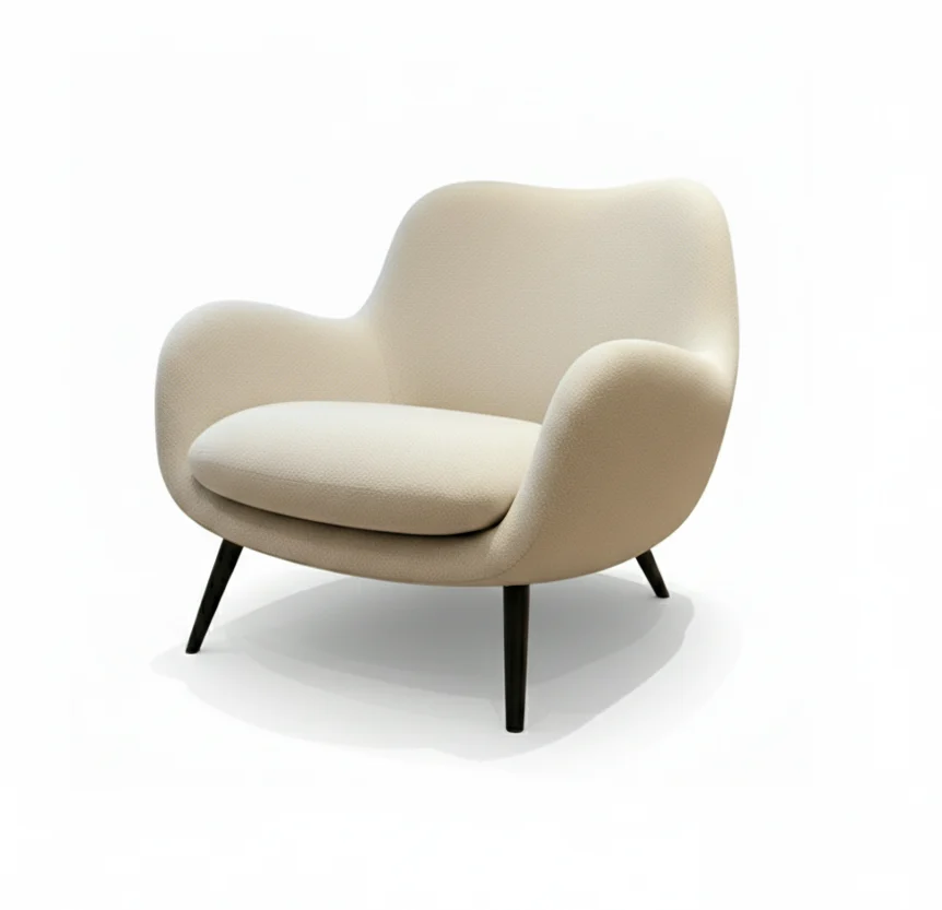 The Petal chair features a curvy, bowl-like shape. The backrest and armrests flow together in one smooth, continuous wave that wraps around you—no separate pieces. The chair sits on four thin, angled legs that taper toward the floor, balancing the heavy, bubbly top. This contrast makes the soft seat appear to float.