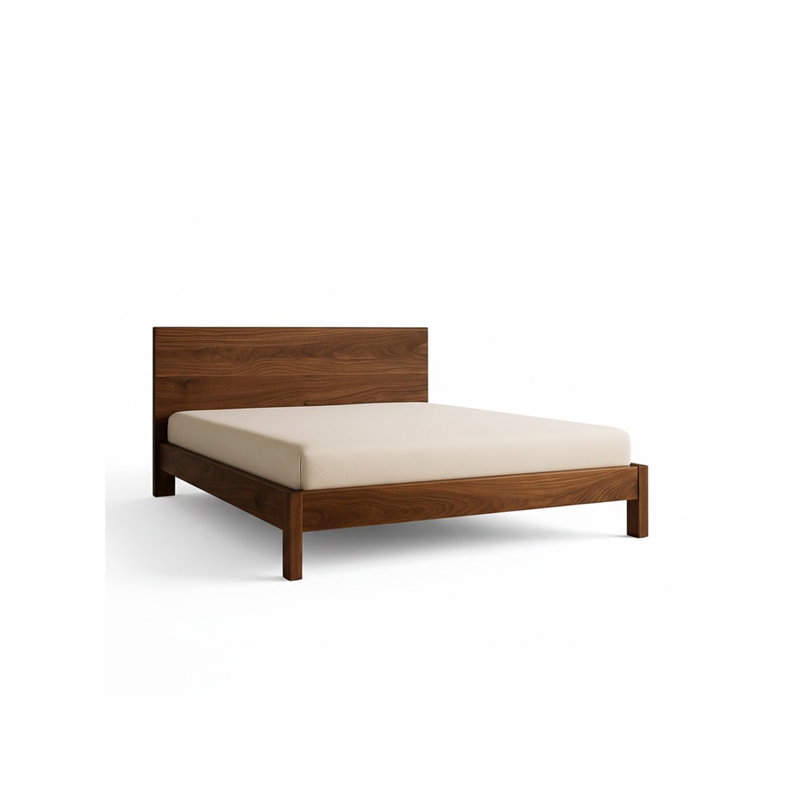 This minimalist platform bed is constructed from a solid wood perimeter frame with a rich walnut-style grain that seamlessly integrates a low-profile, rectangular headboard and sits atop four sturdy, square-cut corner legs to create an elevated, horizontal silhouette.