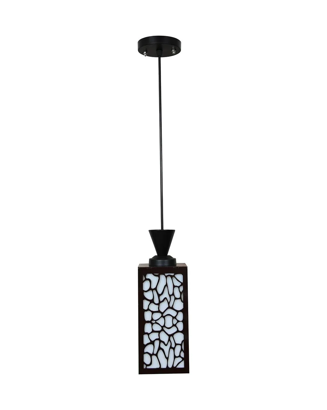 This pendant light features a slender, rectangular silhouette encased in a matte black frame, juxtaposed with an intricate, organic-patterned diffuser.
