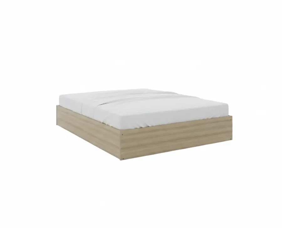 This minimalist platform bed features a low-profile, monolithic structure designed to sit flush against the floor for a grounded, modern aesthetic. The frame is crafted with a light brown wood-grain finish that showcases realistic texture and organic patterns across its continuous side rails.
